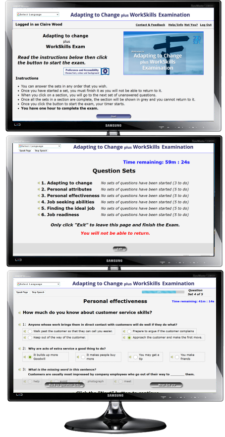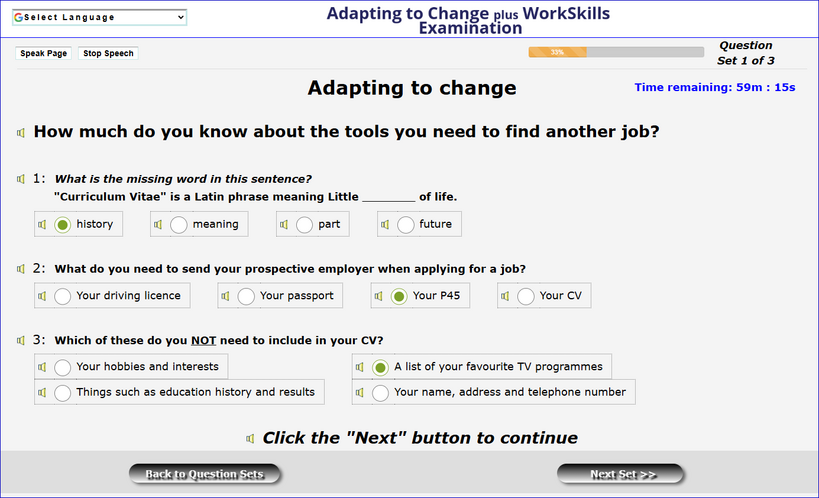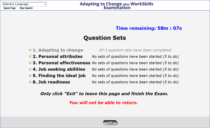 The Examination for Adapting to Change plus WorkSkills contains the same questions as the assessment in the product. These are all questions that check an aspect of job seeking and repeated use helps the user to retain the information.